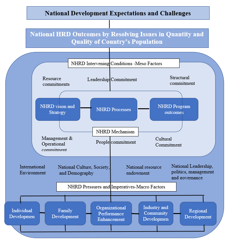 The NHRD mechanism should not only consider meso and macro factors but should be strengthened by the country’s mechanisms related to; individual initiatives taken for development; families’ initiatives taken towards family development; organizations’ HRM and HRD processes that utilize and develop people within organizations; countries’ initiatives taken for industry and community development; and the initiatives extended to local and regional development. These areas provide the bases for different performance contexts in a country’s HCI initiatives at varied levels. This model, therefore, provides a holistic guide that can be used to make decisions on, design, implement, and integrate solutions for human capital issues in related fields of studies and institute praxis towards achieving a superordinate goal─ ’national development’.
